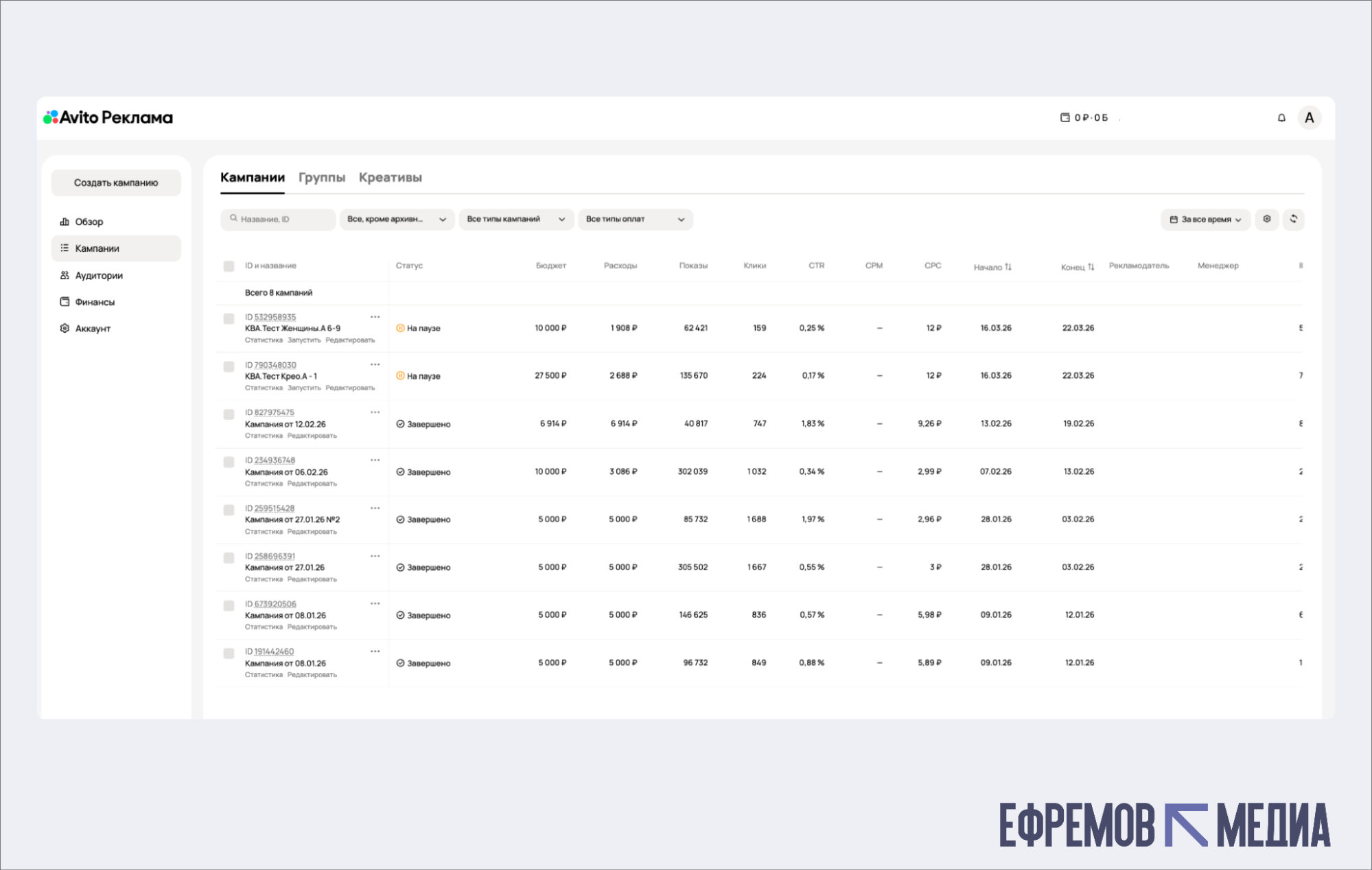 Не принимайте решение по одной цифре CTR. Для медийной рекламы на Авито нормальная кампания может выглядеть скромно по кликам, но тащить конверсии с отложенным эффектом и сделки спустя недели.