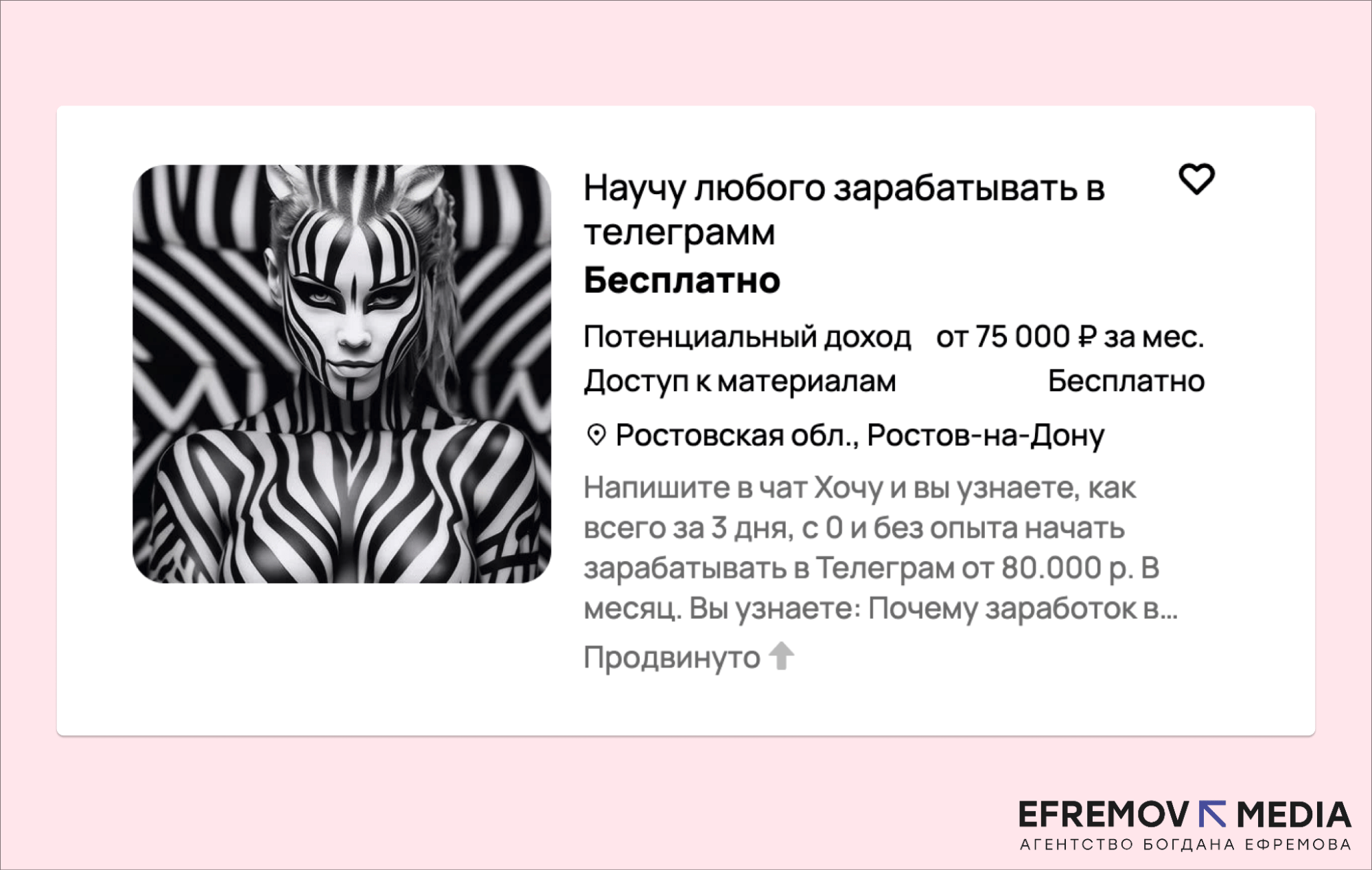 Показываю на примере объявлений про обучение заработку в Телеграме.