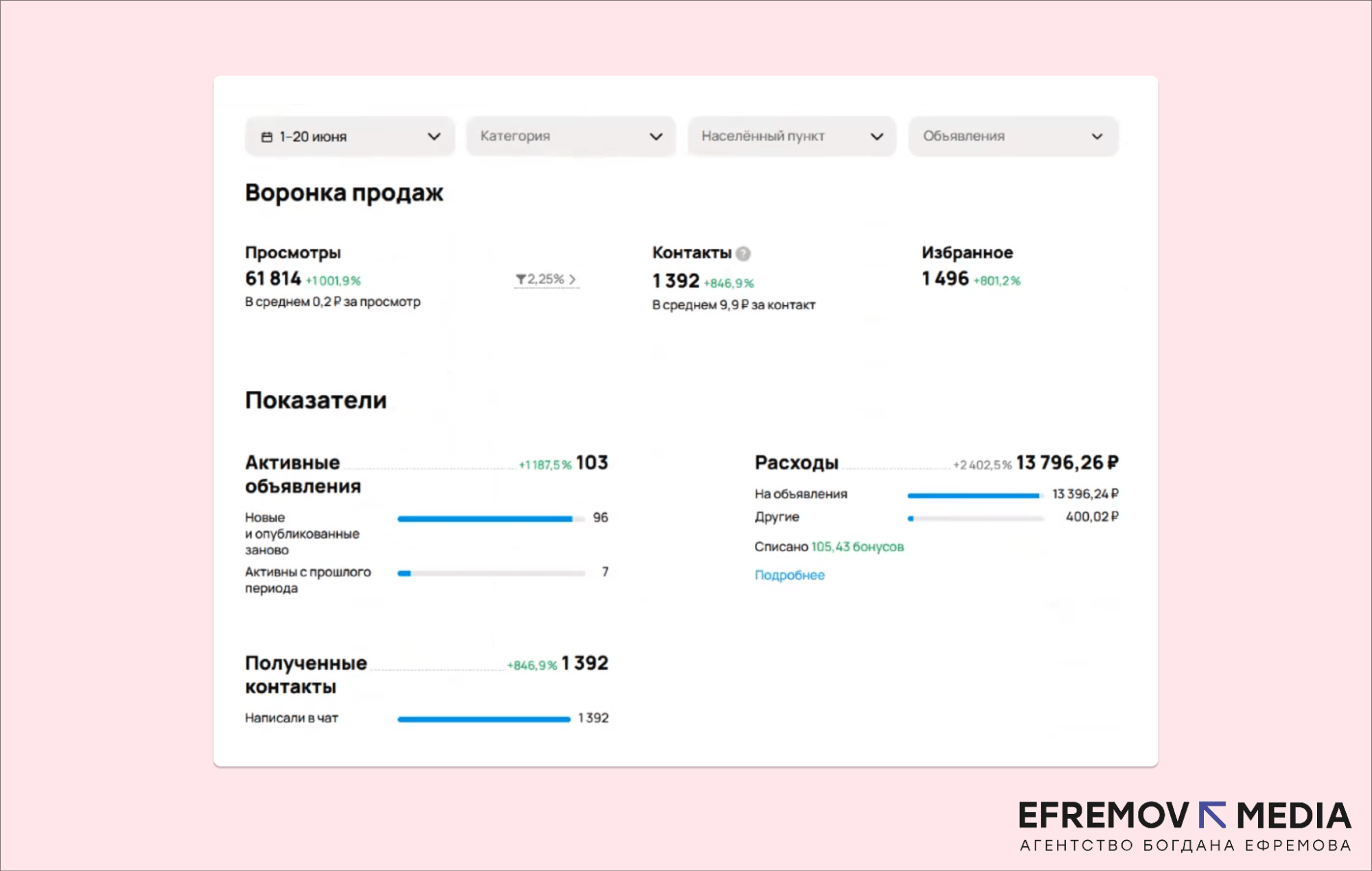 Наш миникейс: за 3 недели июня расход составил 13 тысяч рублей, получено 1400 контактов. То есть стоимость контакта — около 9 рублей при 61 тысяче просмотров и полутора тысячах добавлений в избранное