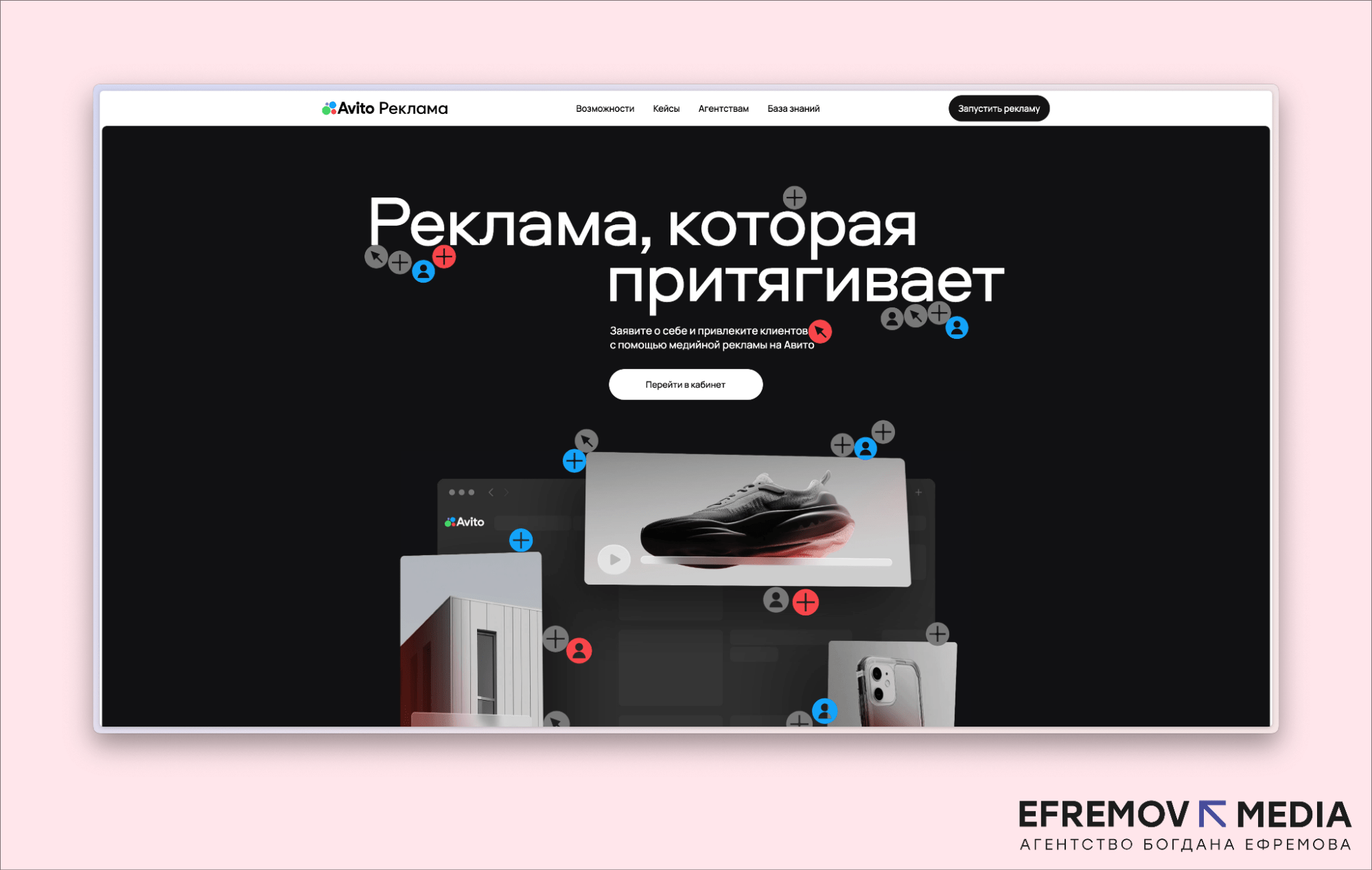 Раньше такое можно было делать через Яндекс. Теперь Авито даёт возможность запускать медийную рекламу прямо внутри своего кабинета — её показывают как можно больше и чаще.
