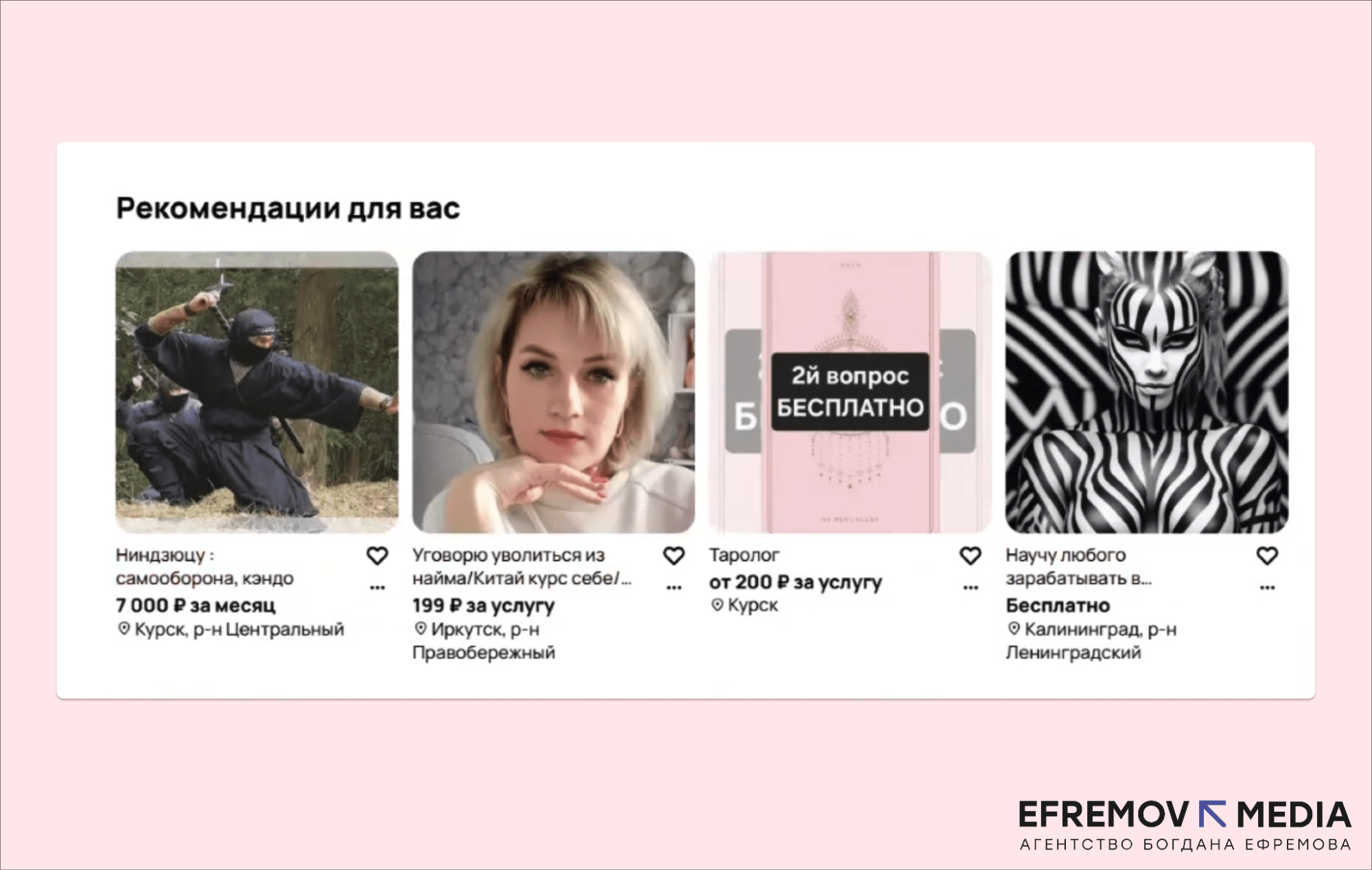 На Авито инфобизнес работает не только по прямым запросам типа «обучение нейросетям». Главная фишка — умная лента. Авито показывает креативные объявления в рекомендательной выдаче тем, кто их не искал, но кому это может быть интересно и полезно.