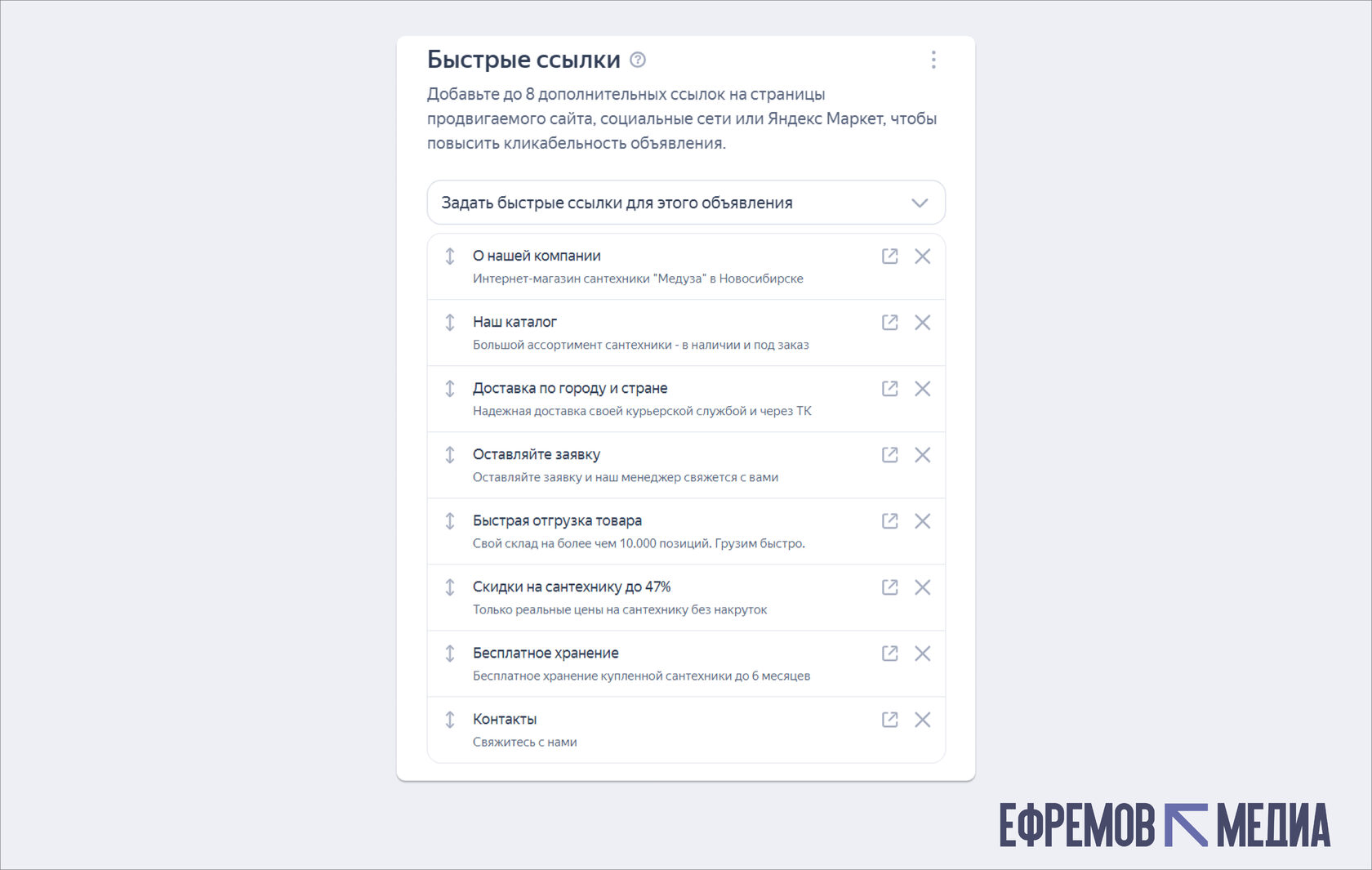 Многие рекламодатели добавляют быстрые ссылки, потому что это рекомендуют в каждом гайде. Но настраивают их халатно: копируют пункты из меню сайта, не думая о том, что ищет клиент за три секунды. Результат предсказуем — объявление отклоняют на модерации или оно показывается без эффекта.
