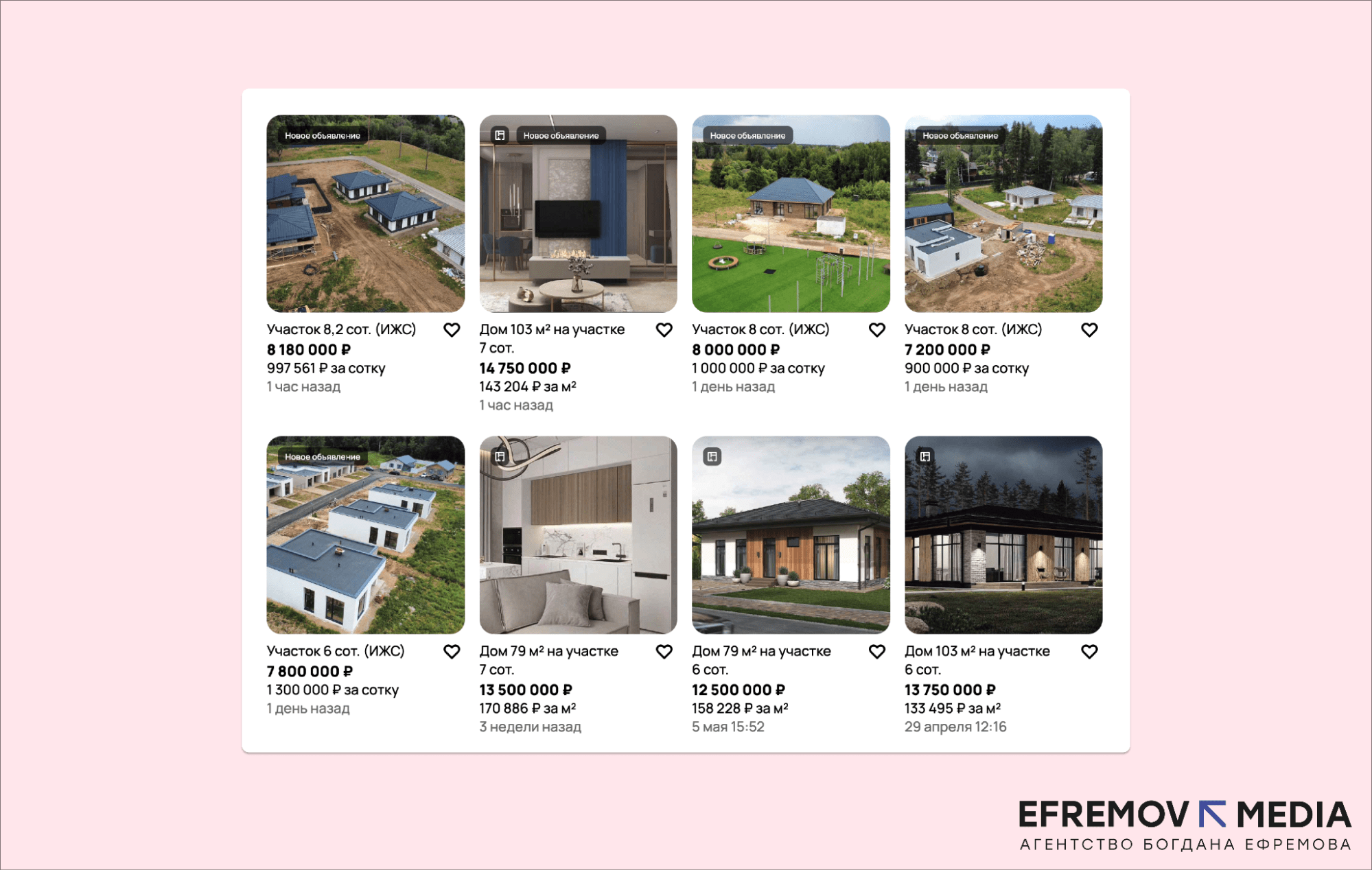 Клиент продавал участки с возможностью построить дом через застройщиков. А на некоторых участках дома уже построили — можно купить готовый дом. На Авито это две разные категории. Нам важно охватить оба сегмента.
