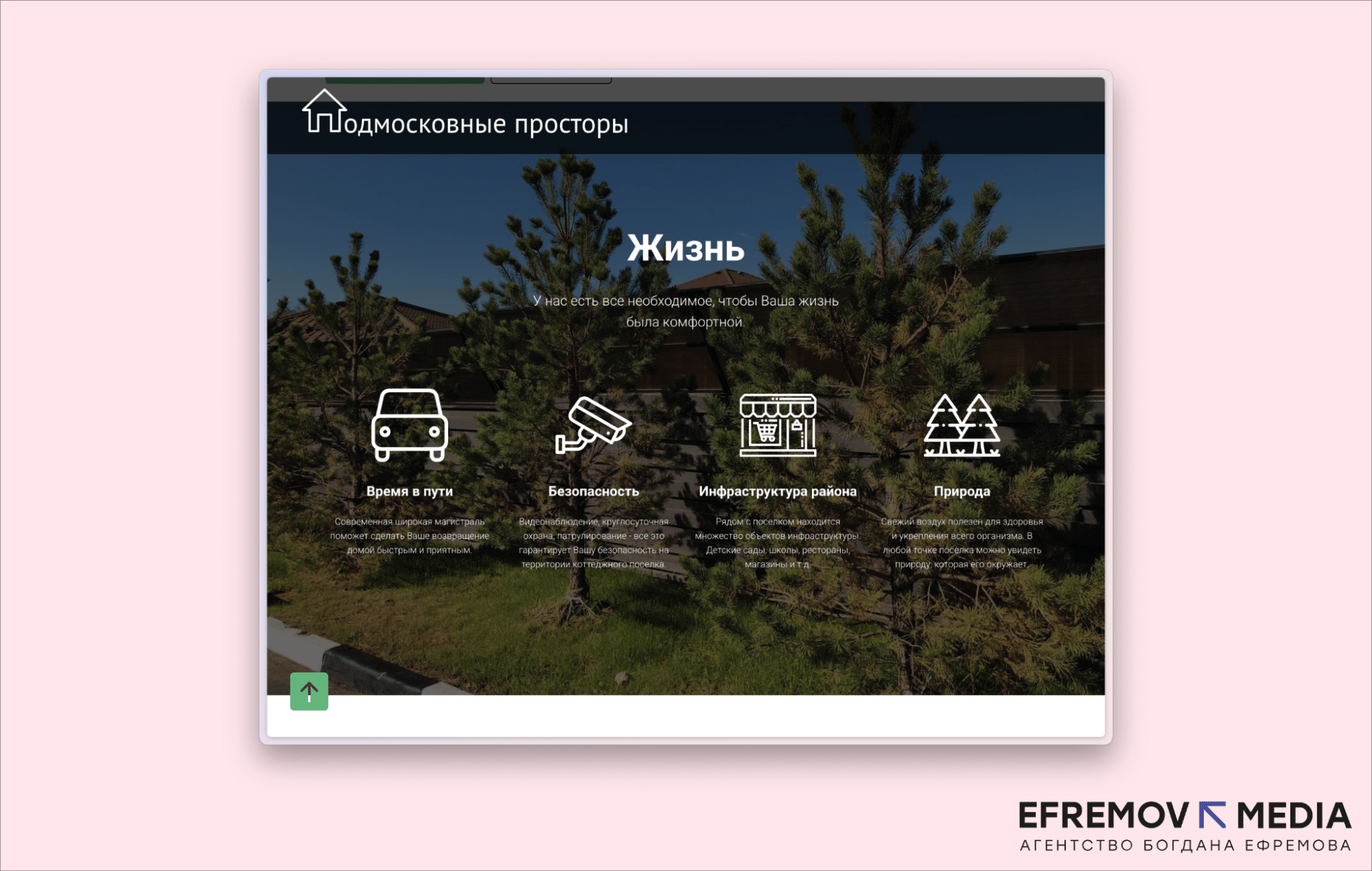 «Подмосковные просторы» — это компания по продаже коттеджных посёлков на востоке, северо-востоке и западе Москвы. Мы продвигали два посёлка — «Литвиново Вилладж» и «Афинеево Парк» — в 30 километрах от МКАД в Московской области. Средняя цена на участок с домом — от 10 до 20 миллионов рублей.