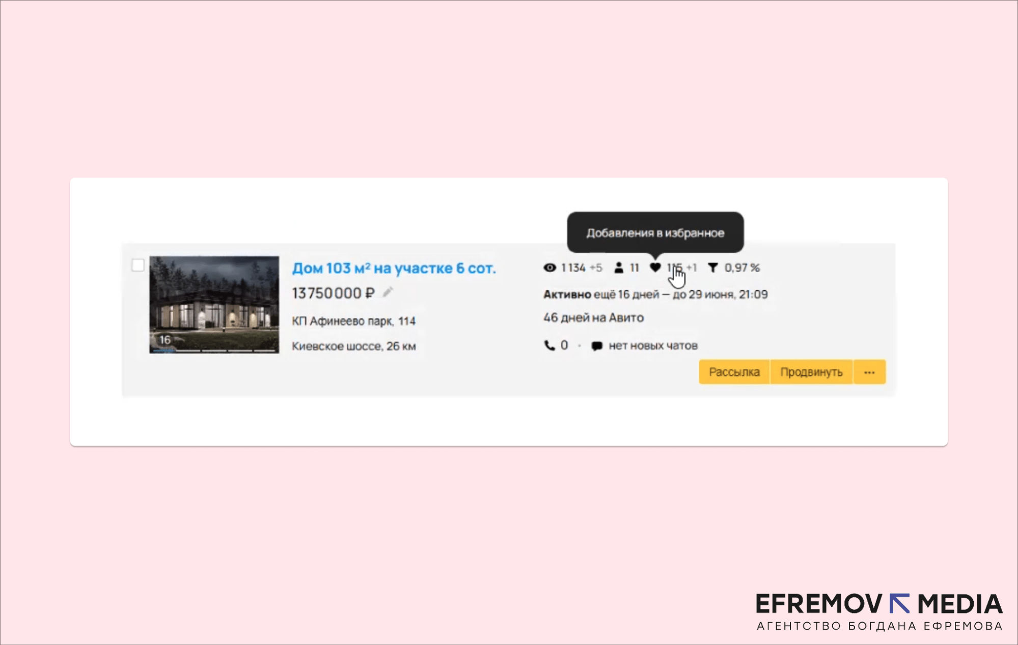 Например, за 30 дней объявление добавили в «Избранное» 115 раз. Контактов при этом 11 — основная аудитория прошла мимо, но ей можно напомнить о себе рассылками