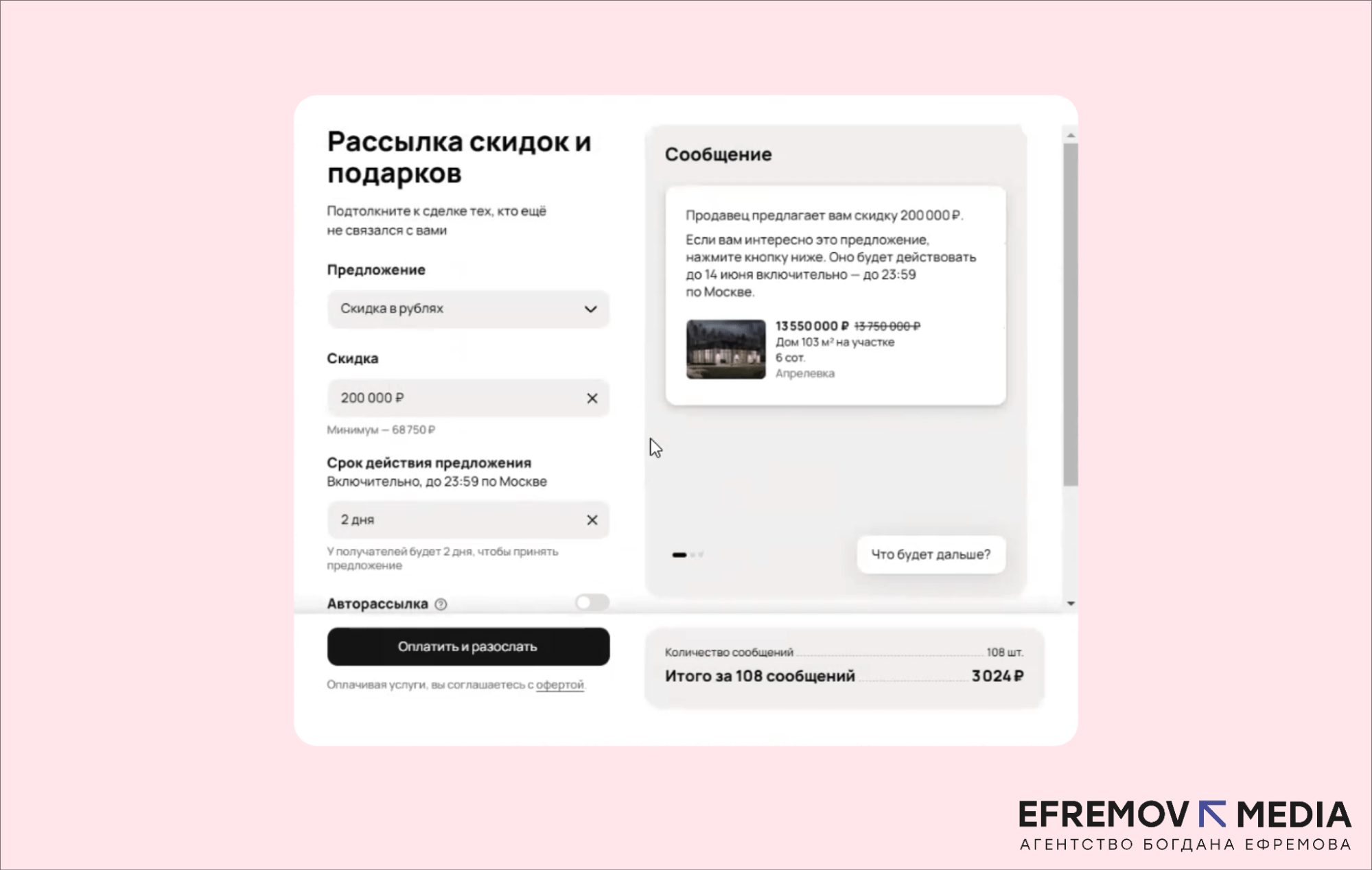 В рассылке можно предложить скидку в конкретной сумме или процентах от стоимости дома или участка