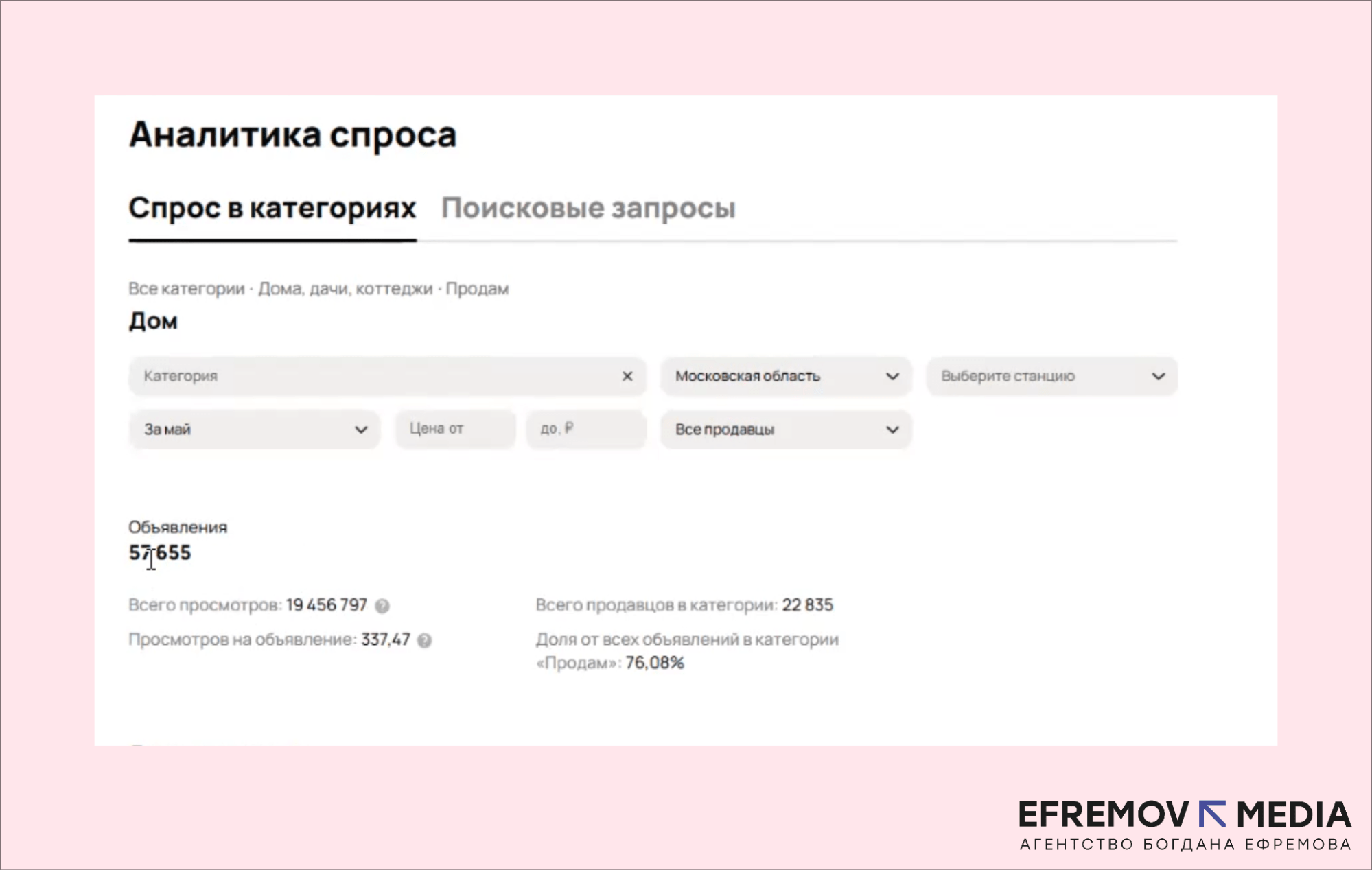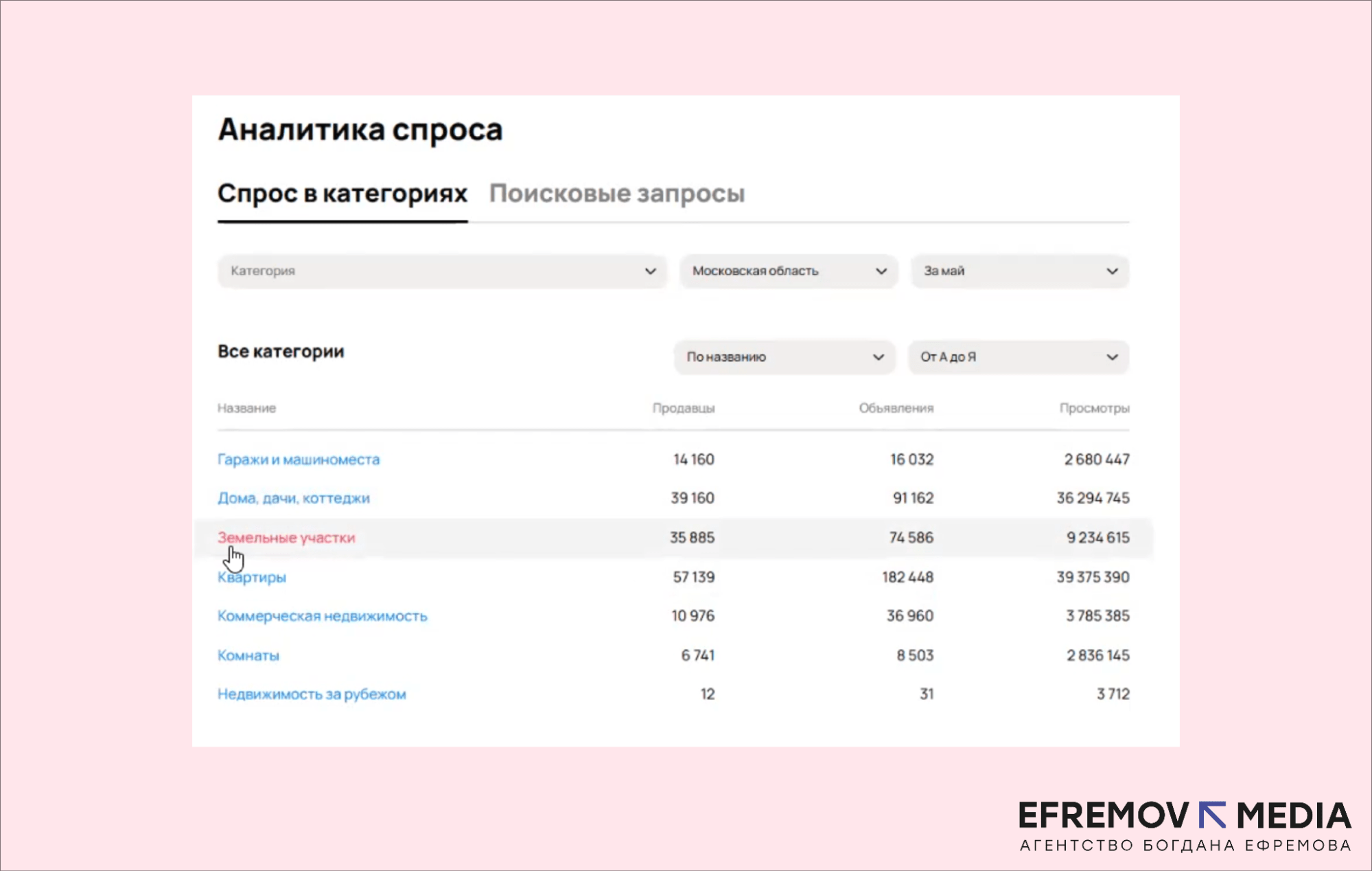 В мае дома набрали 20 миллионов просмотров. А земельные участки — 9 миллионов, в два раза меньше. Так мы выявили, что будем разделять объявления на две группы и делать больший упор на продажу готовых домов