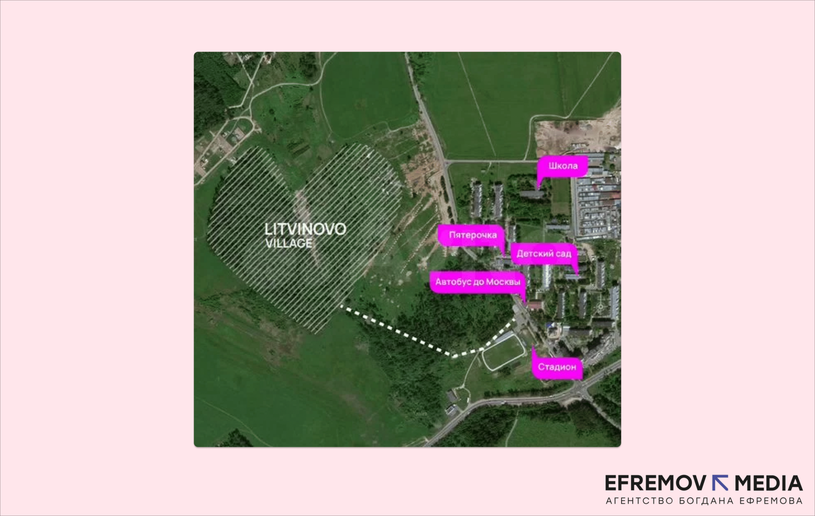 Для продажи земельных участков сложно придумать что-то уникальное. Так что мы рассказывали о стандартных вещах: локация, близость к магазинам, школам, МКАДу.