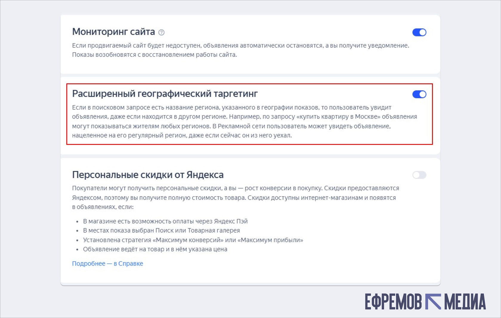 Расширенный геотаргетинг — настройка, при которой Яндекс показывает объявление пользователям за пределами выбранного региона, если они вводят запрос с его названием.