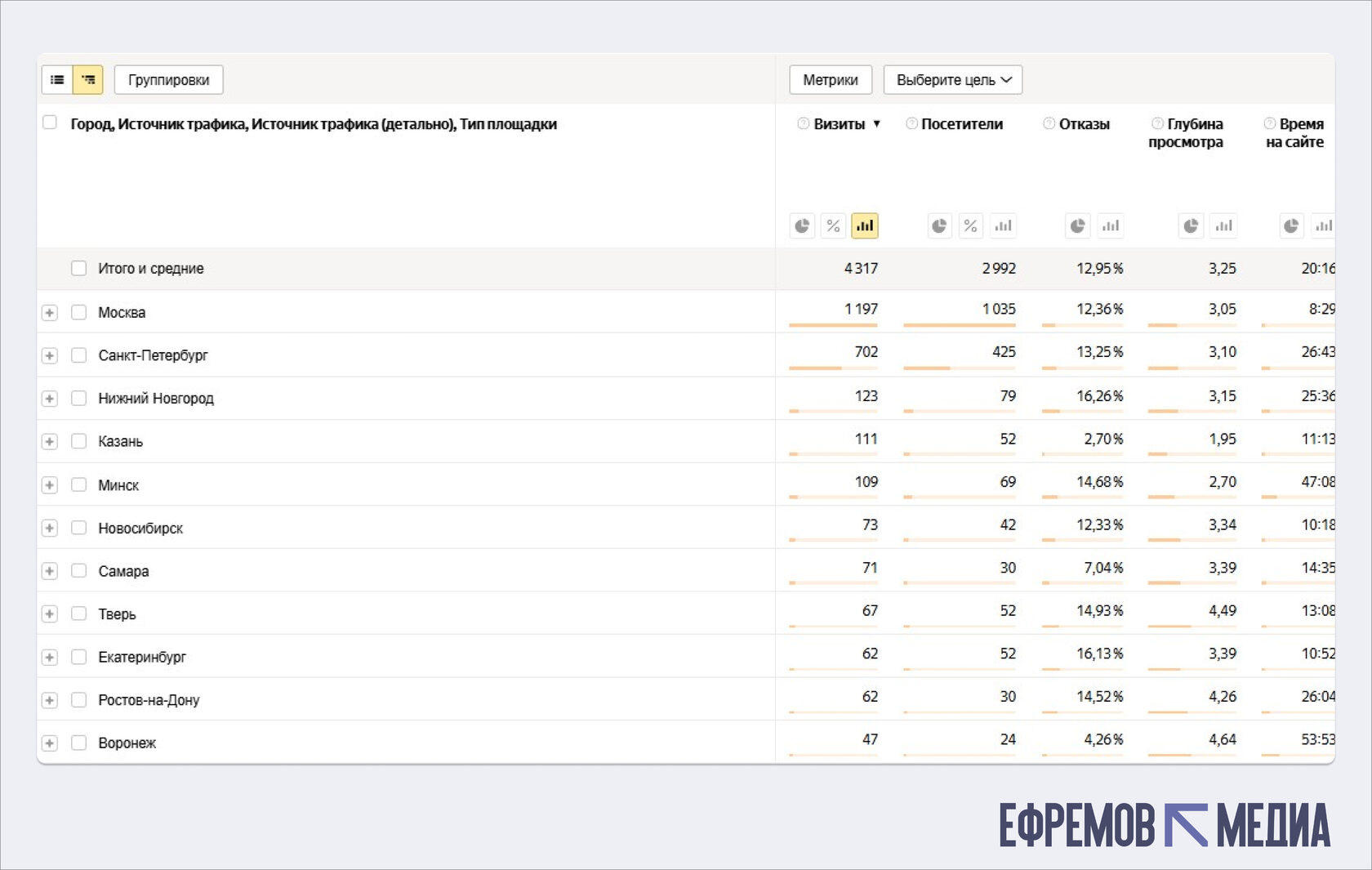 Скриншот отчёта в Яндекс Метрике по географии — сегменты по городам