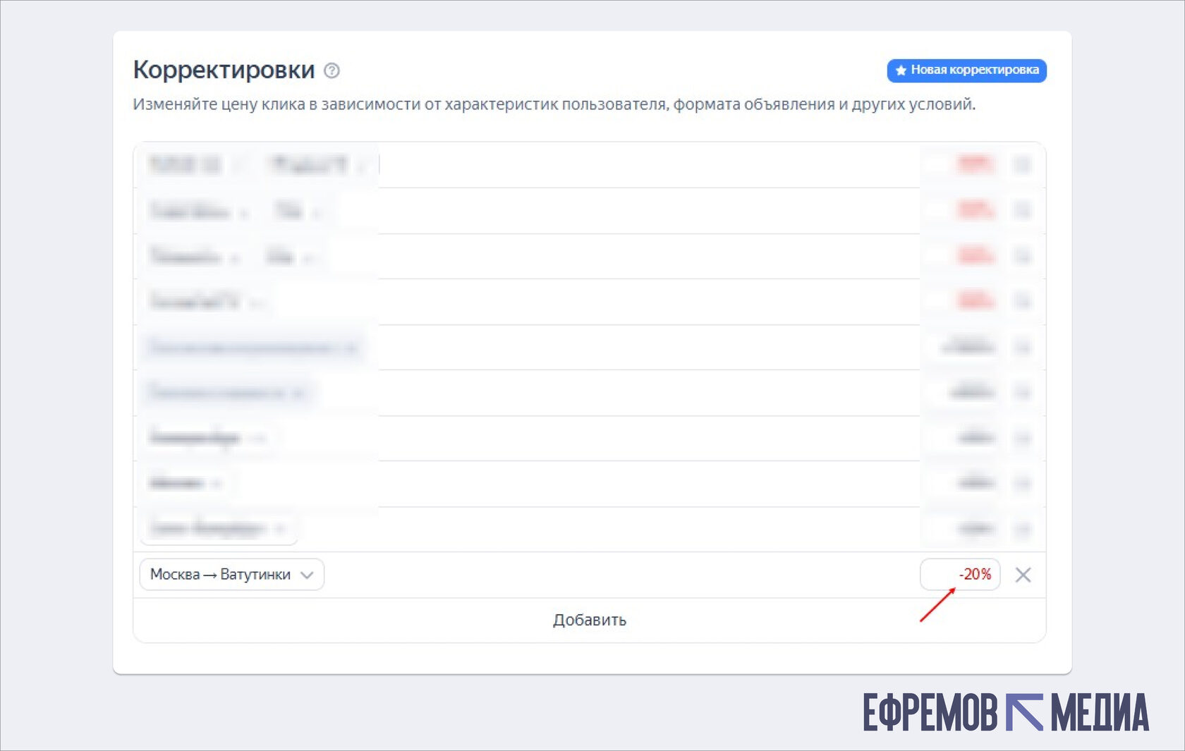 Как настроить: откройте кампанию в Яндекс.Директе, перейдите в раздел «Регионы показов» и нажмите «Корректировка ставок». Выберите регион и задайте коэффициент. Корректировка умножается на базовую ставку: например, если базовая 50 ₽, а корректировка +50%, итоговая ставка для этого региона — 75 ₽.