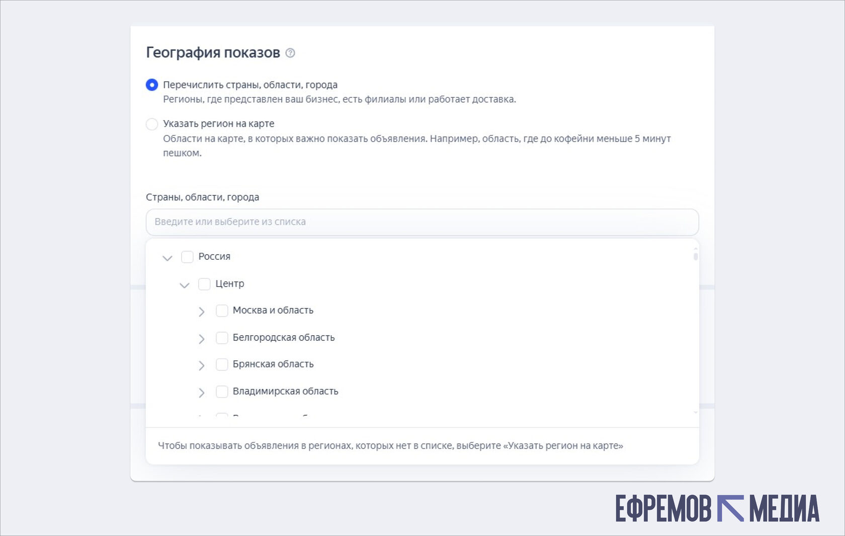 В Яндекс.Директе это делается так: откройте раздел «География показов» на уровне группы объявлений или кампании, выберите опцию «Страны, области, города» и раскройте геодерево нужного региона. Система даёт подсказки по названиям — достаточно начать печатать, и Яндекс предложит варианты.