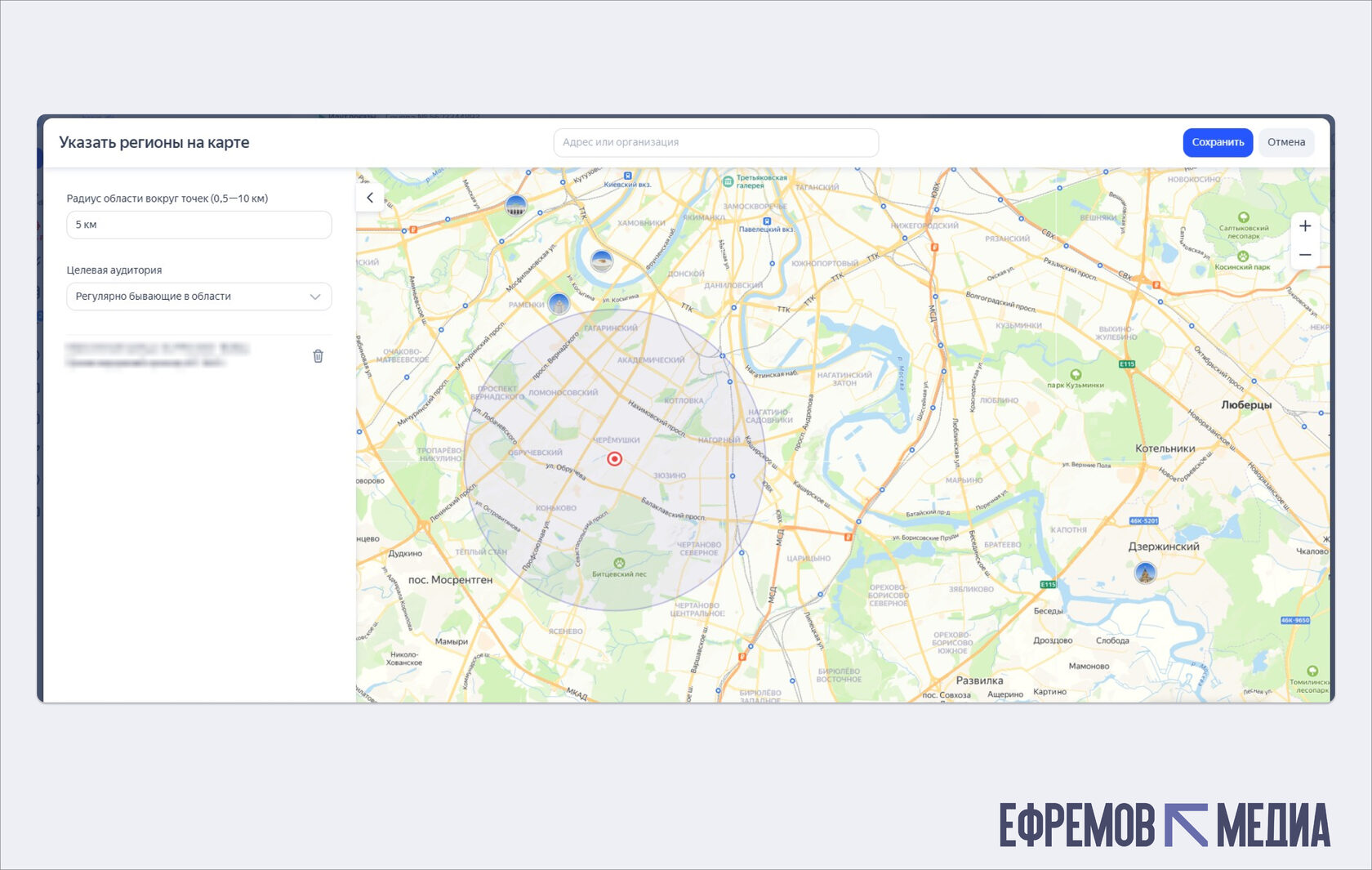 Интерфейс добавления точного адреса и настройки радиуса в Директе