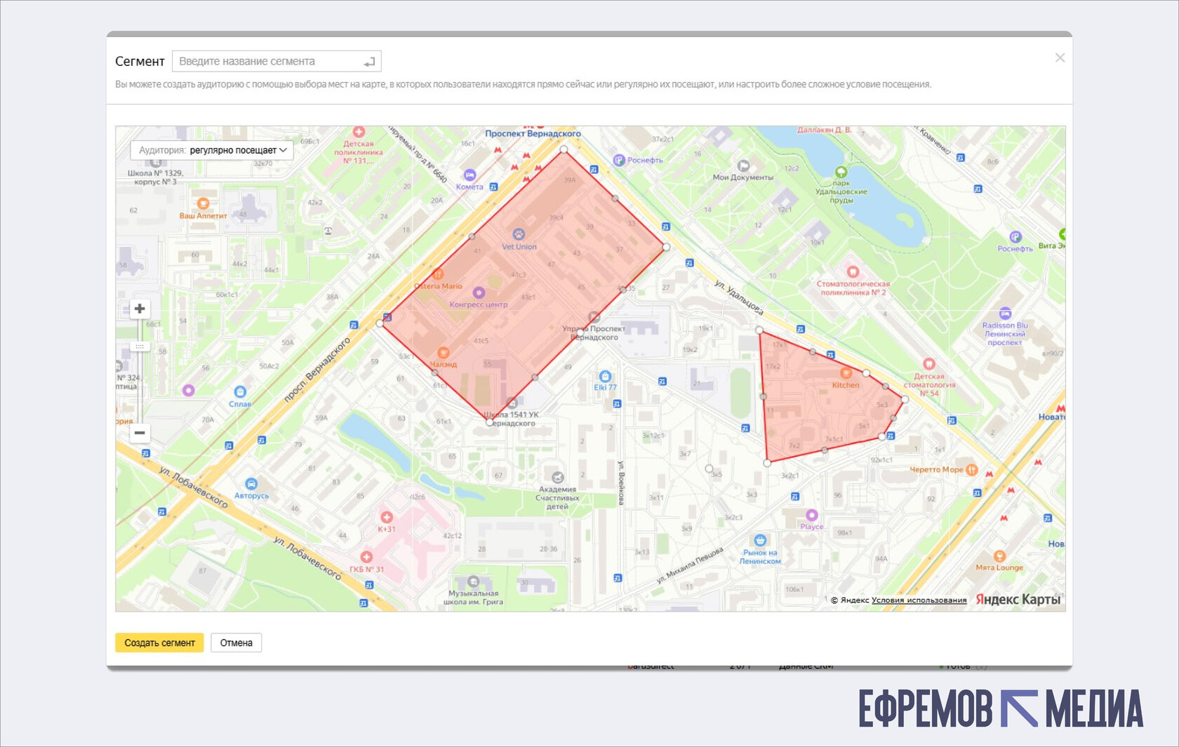 Полигоны — инструмент Яндекс.Аудиторий для ручной разметки территории на карте. Точки расставляются и соединяются линиями, как в конструкторе. Полигон может быть сложной формы: район целиком, отдельное здание, несколько кварталов. В одном сегменте — до 10 полигонов общей площадью до 10 км².