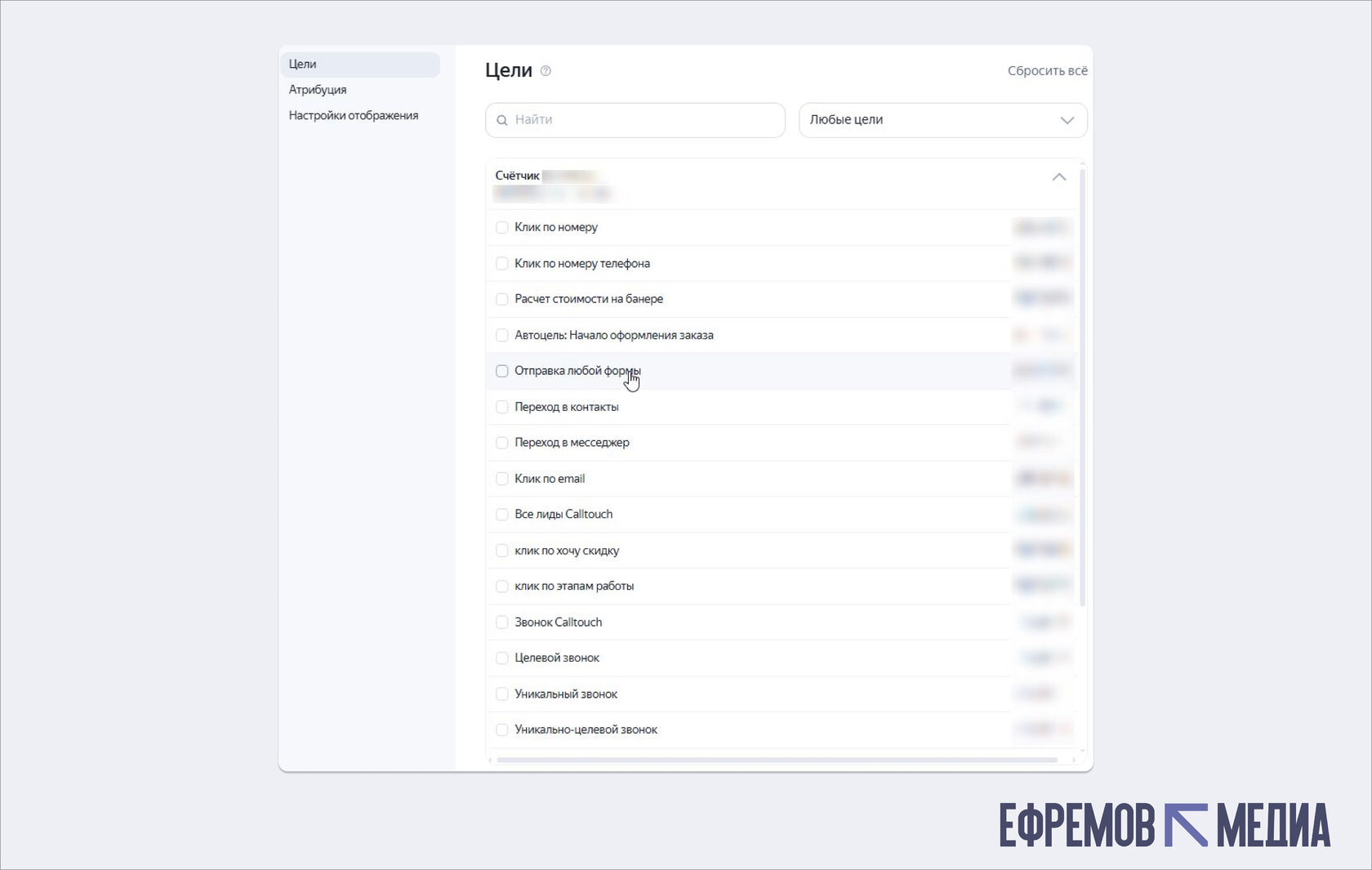 В настройках кабинета видны все установленные цели и способы их отслеживания