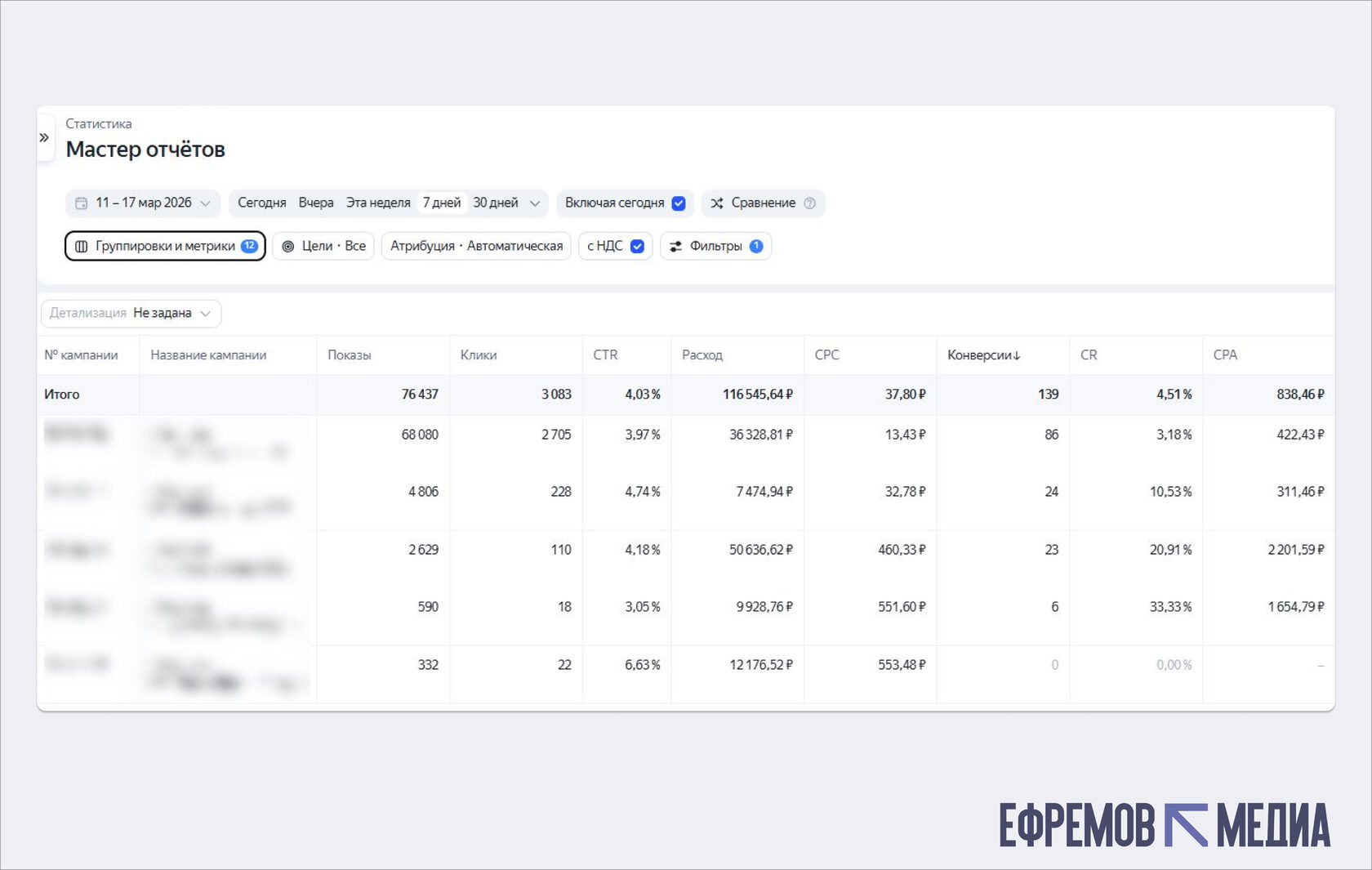 Анализ по срезам, не по итогам. Директ устроен так, что данные нужно смотреть в разрезе: по кампаниям, по полу и возрасту, по устройствам. В справке Мастера отчётов приведён пример такого анализа. Просмотр общей строки «итого» скрывает реальные проблемы.