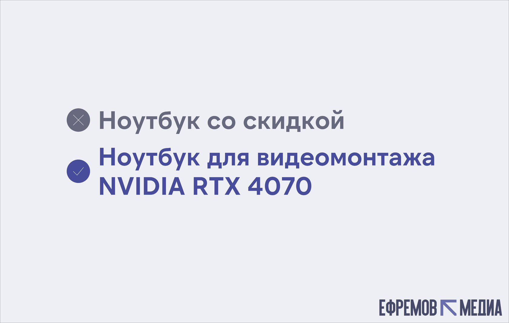 П (Прицельный) — заголовок адресован конкретной аудитории. «Ноутбук для видеомонтажа, NVIDIA RTX 4070» адресован контент-мейкерам. «Ноутбук со скидкой» — ни для кого не адресован.