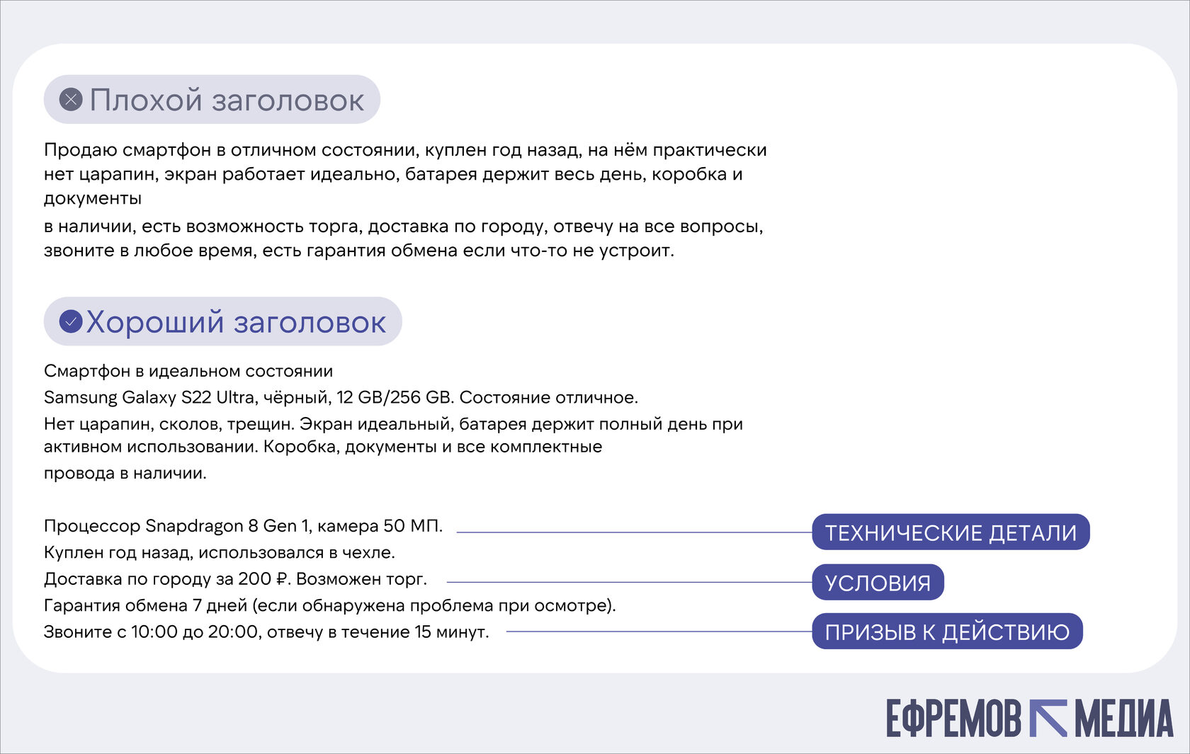 Покупатель читает заголовок за две секунды, и на основе этих 50 символов решает, что ему сделать — кликнуть на объявление или прокрутить дальше. Неправильный заголовок закроет объявление от нужных людей.