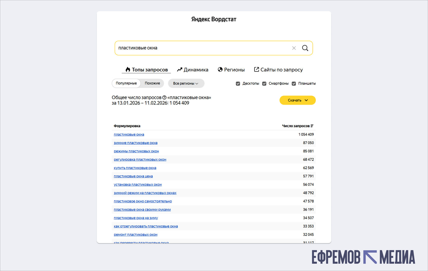 Яндекс.Вордстат — основной бесплатный инструмент для анализа спроса в российском сегменте интернета. Введите базовую тематику в поисковую строку сервиса и изучите статистику по запросам. Wordstat показывает частотность ключевых слов, похожие запросы и региональное распределение спроса.