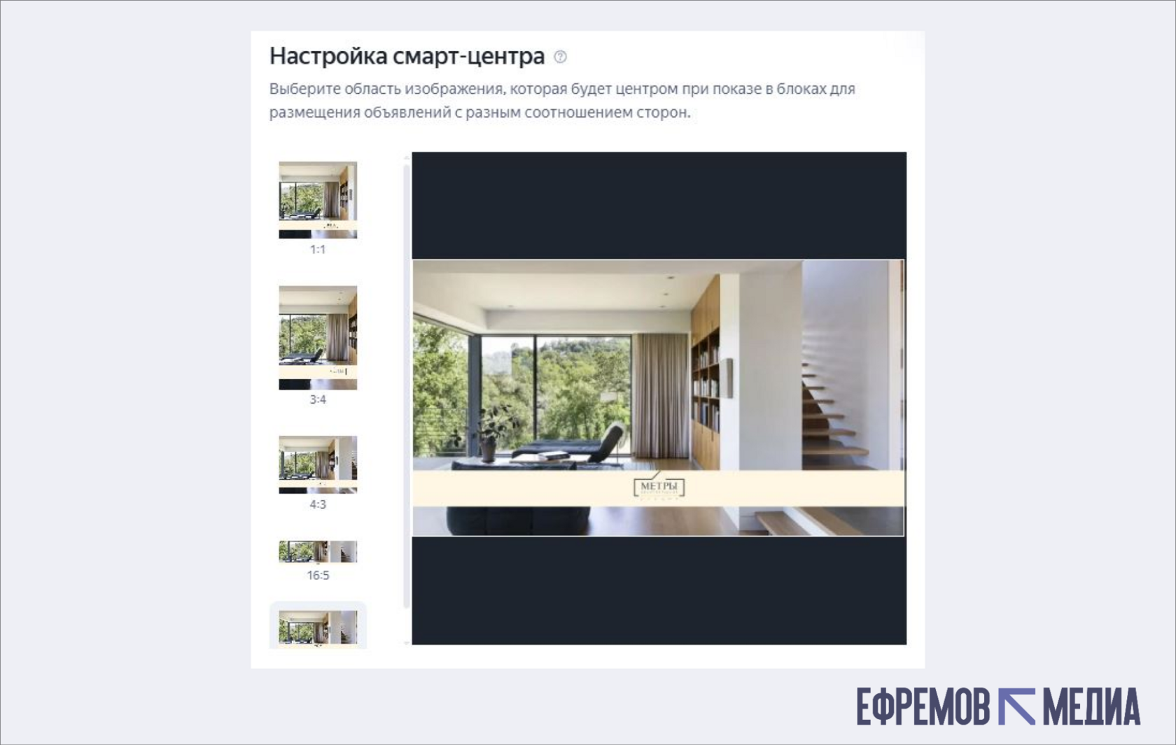 Как защитить ключевую область. Сначала система автоматически создаёт набор из пяти смарт-центров с разными пропорциями (1:1, 4:3, 3:4, 16:9 и 16:5), а затем выбирает тот, который лучше подходит под размер конкретного блока. Смарт-центр защищает главную область изображения и сохраняет видимость ключевых элементов при обрезке.