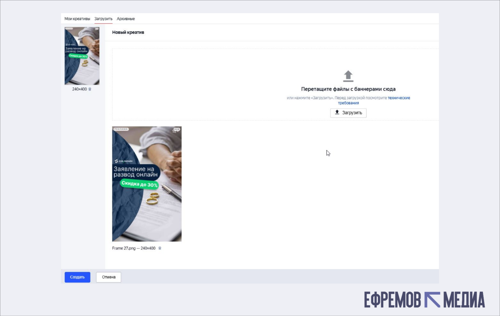 Готовый графический креатив загружается файлом с соблюдением размера блока и требований к весу