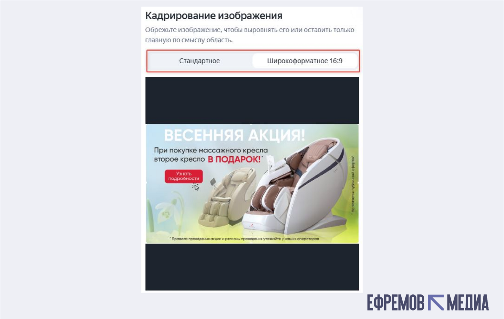 Смарт-центр — это главная по смыслу область на изображении, которая должна остаться видимой при обрезке на разных площадках. При размещении баннер может быть уменьшен или обрезан в зависимости от размера рекламного блока. Смарт-центр помогает защитить ключевые элементы (например, лицо человека или логотип) от потери при масштабировании.