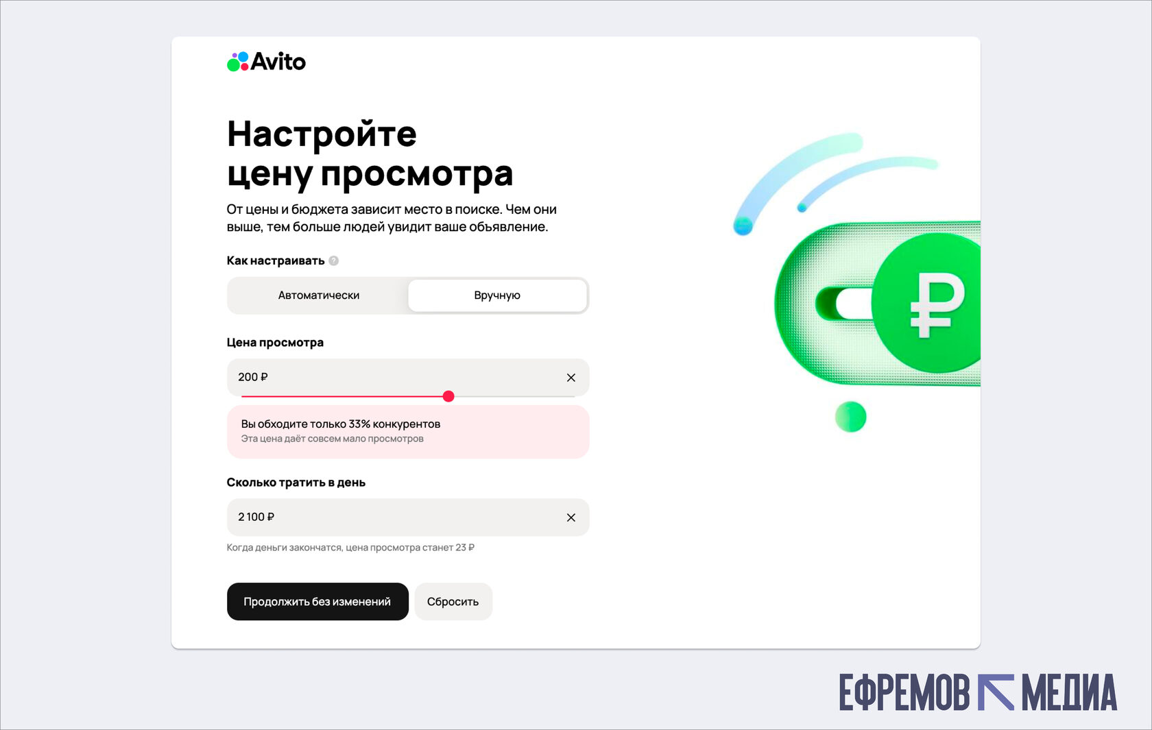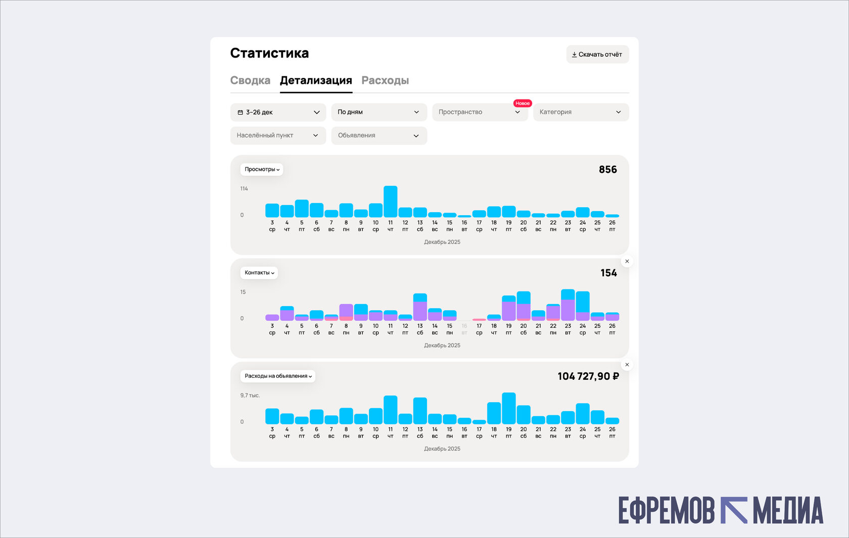 Дневные бюджеты. При использовании платных услуг можно установить лимит и отслеживать статистику в реальном времени. Авито обновляет данные каждые 15 минут — можно быстро реагировать и корректировать стратегию.