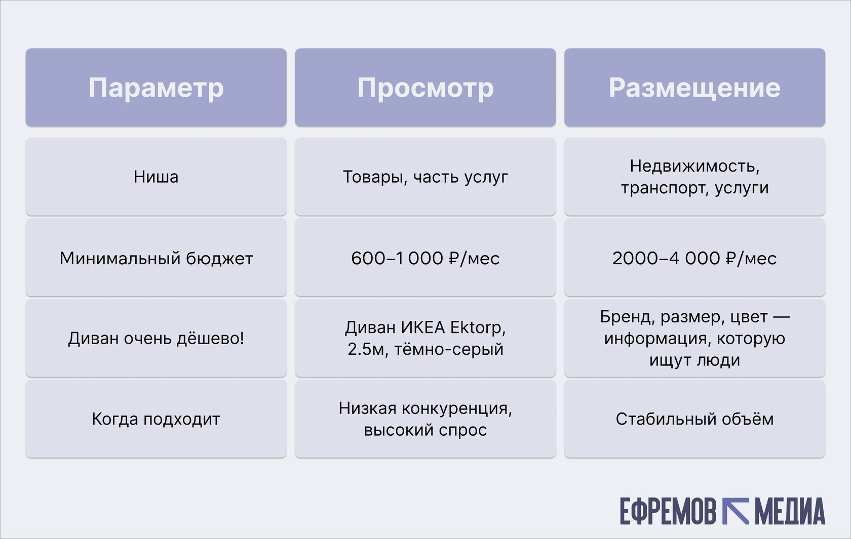 Для старта лучше тариф с оплатой за просмотры. Вы платите только за реальный интерес к объявлению и контролируете расходы. Фиксированные тарифы за размещение выгодны, когда вы уже знаете свою конверсию, понимаете стоимость клиента и уверены в спросе.