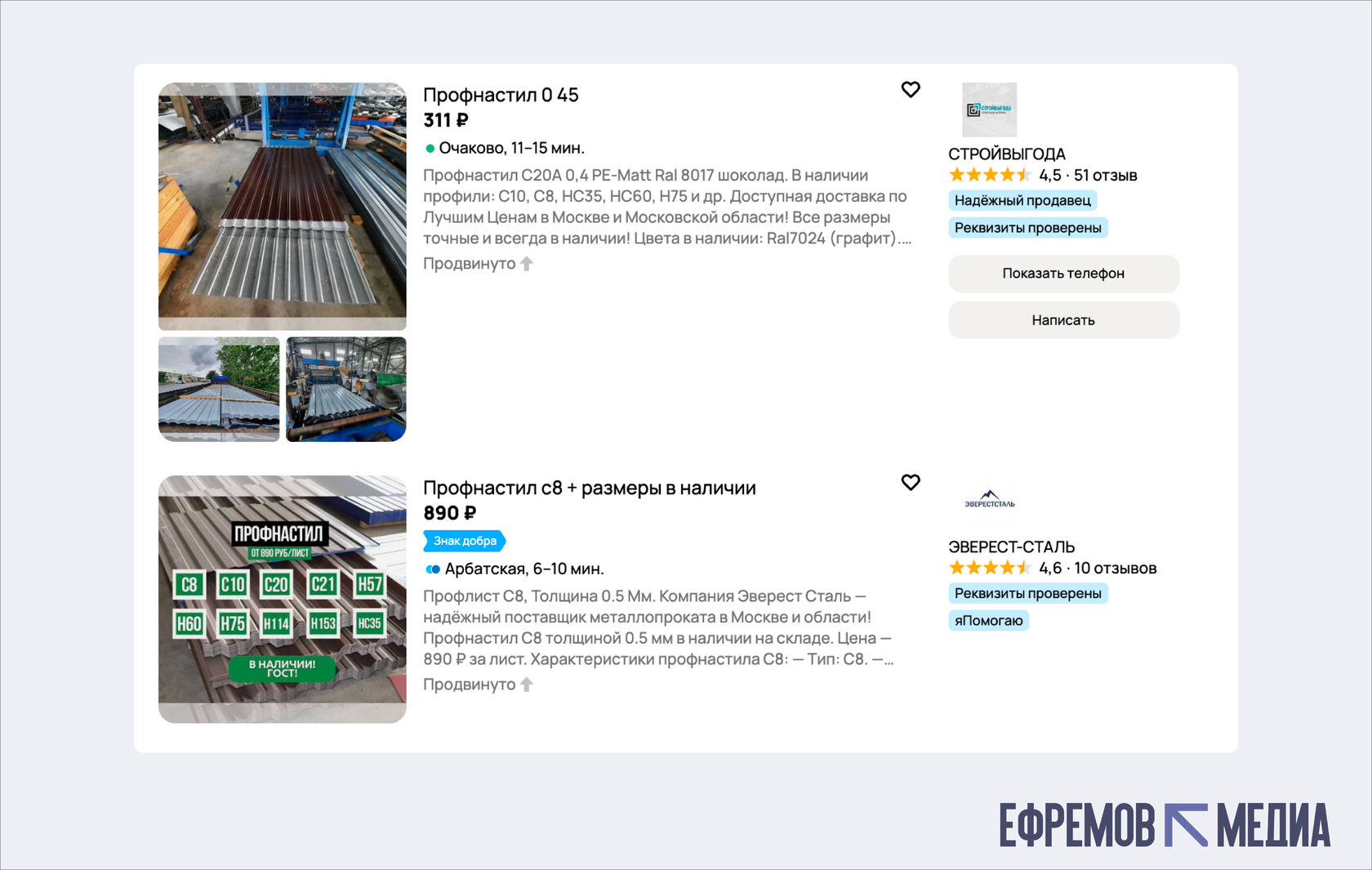 XL-объявление. Увеличенный формат рекламы: на странице поиска показываются сразу до трёх фотографий и контакты продавца. Такое объявление привлекает больше внимания пользователей и повышает кликабельность.