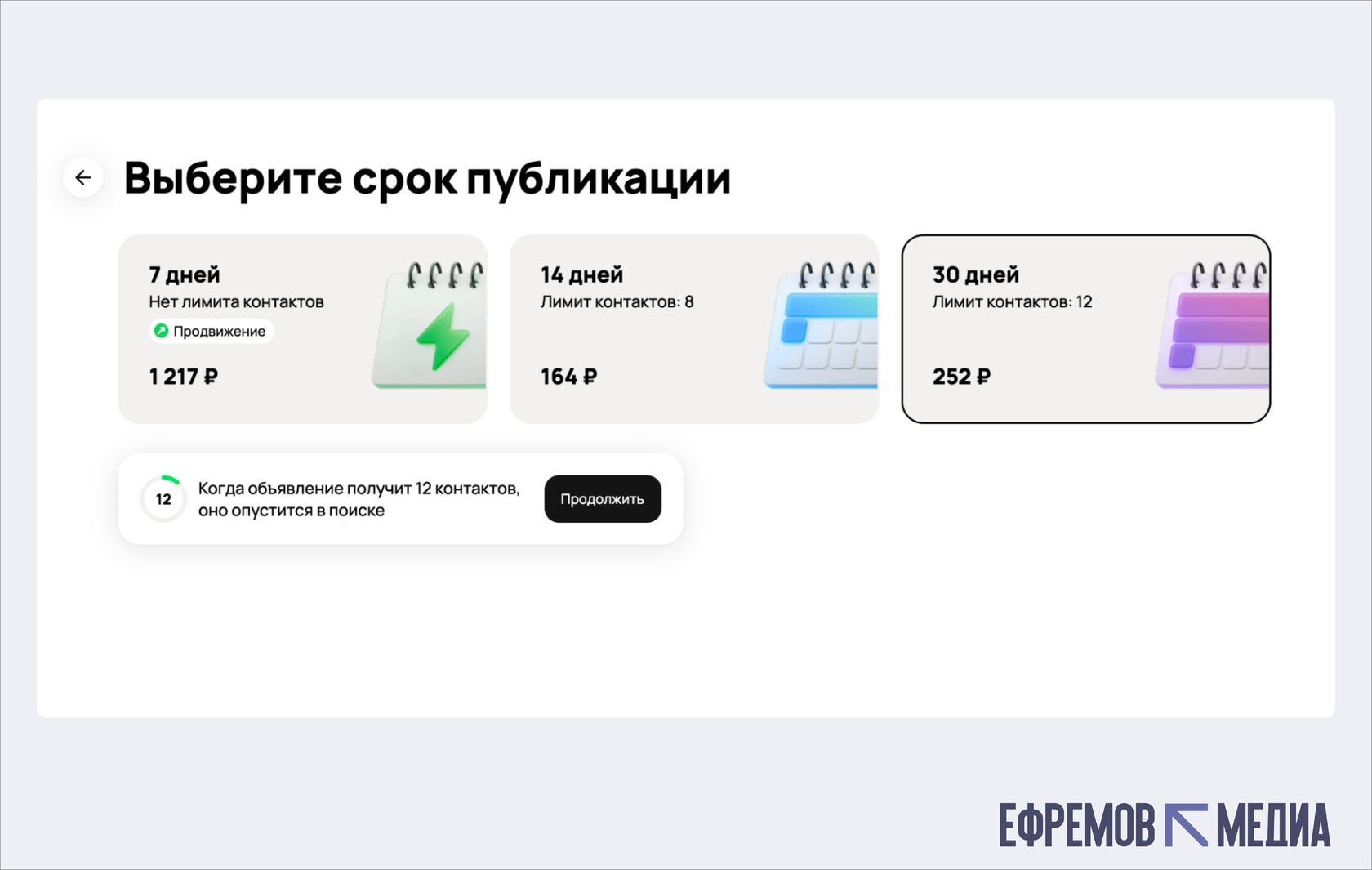 Тариф действует для категорий «Недвижимость», «Транспорт» и некоторых видов услуг. Здесь вы платите фиксированную сумму за публикацию объявления на 14 или 30 дней — независимо от количества просмотров и контактов.