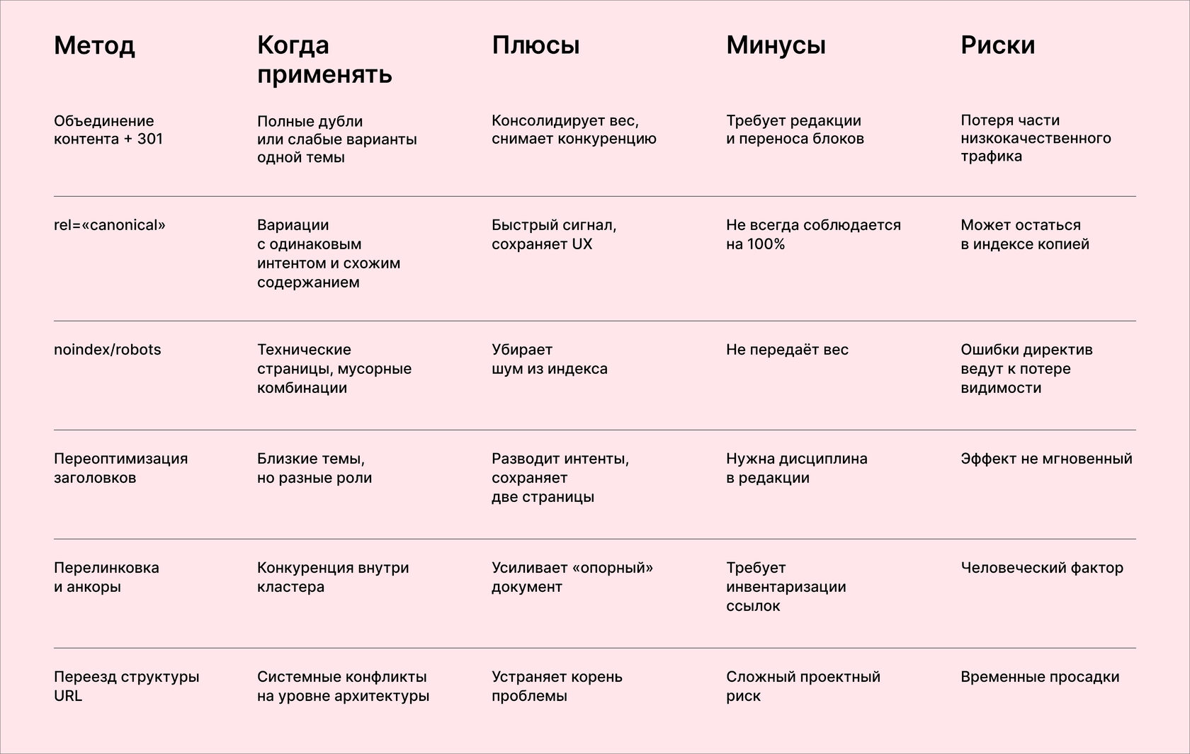 Главный принцип — у каждого интента должна быть одна опорная страница. Остальные либо поддерживают её, либо перенаправляют вес. Для этого объединяют дубли, ставят 301-редиректы, указывают canonical, корректируют заголовки и анкоры, а при необходимости перестраивают внутренние ссылки.
